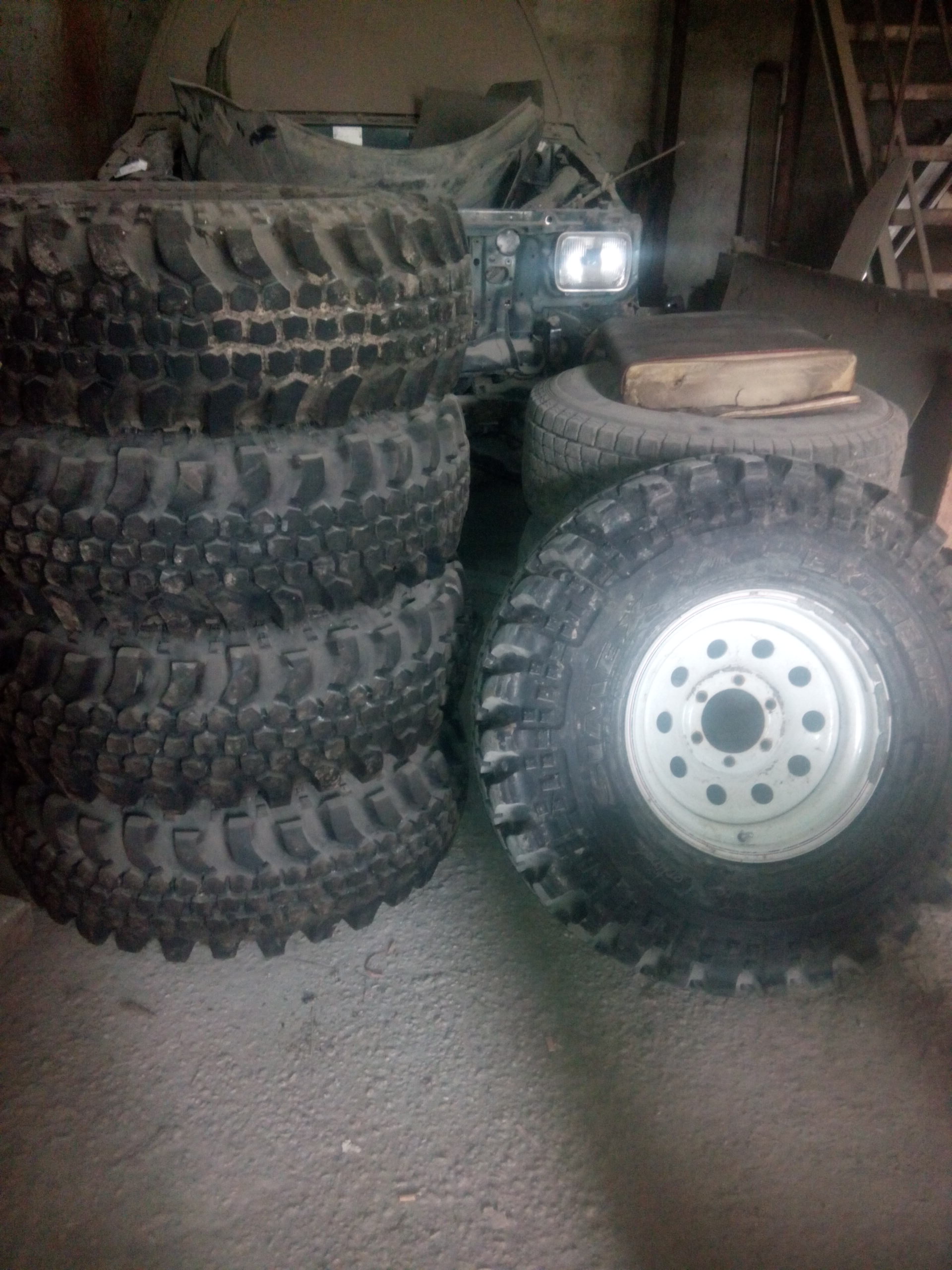 Породам SIMAX EXTREME TREKER 2 в размере 36/12,5/16 пять штук. Остаток по центру 15 мм. Колёса собраны и отбалансированы. В Чухломе без них никак, проверено лично на мероприятии в 2015 году. Стояли на 80-ке.