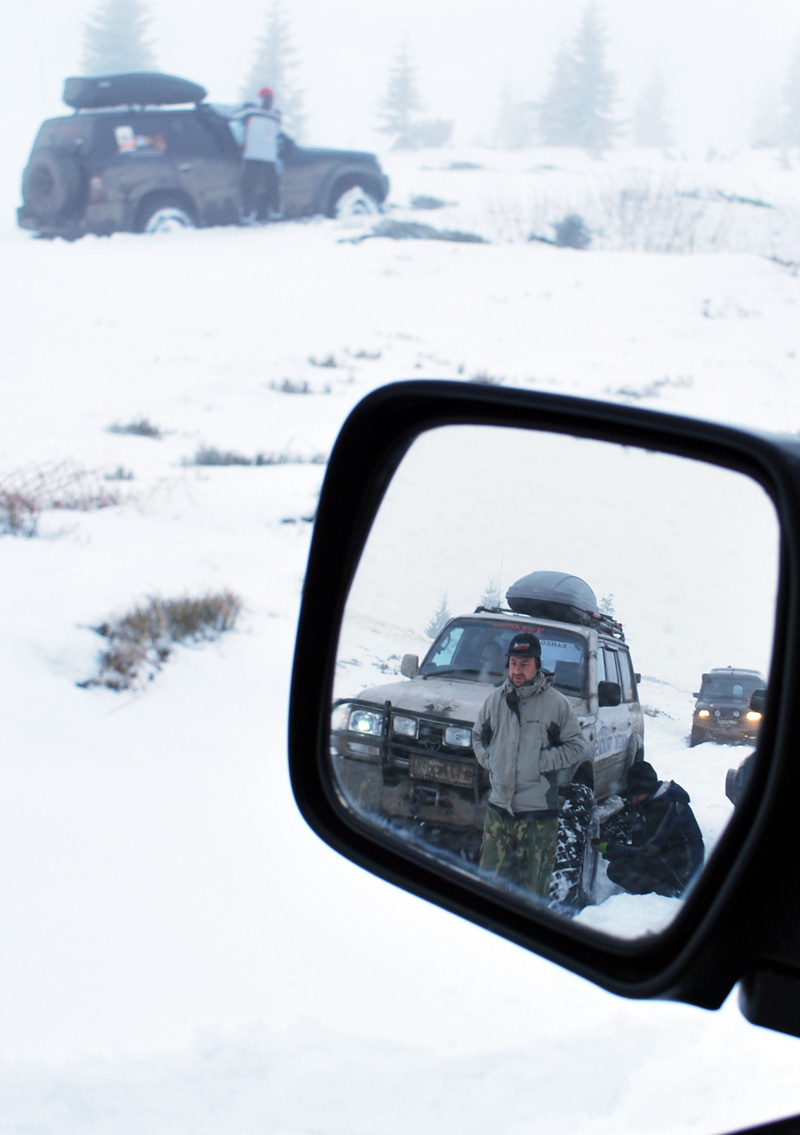 ......Ночь. Завывает жуткая метель, кромешная тьма кругом, ветер сбивает их с ног, срывает одежду. Температура стремительно падает. Обледеневшая одежда не дает согнуть руку. Онемевшие пальцы их ног могут уже никогда не почувствовать живого тепла домашнего камина. Они крайне измотаны.А пропасть так близка. Скользкая дорога едва нащупывается в расщелине. Лед. Голый лед. Кругом.Зацепиться не за что, а уклон запредельный, такой, что моргают лампочки аварийного давления масла! Машины скользят. Цепи порваны острыми камнями в клочья, шипы не держат машины. Тревожно ревут дизеля.Жалобно воют раскаленные лебедки. Тросы натянуты ,как нервы , до последнего предела, в последнем порыве, в последней надежде сопротивляясь обезумевшей стихии. Им уже не спастись. Поздно. Слишком поздно... Снежный заряд пришел внезапно. Никто не ждал такого ада. Они без пищи уже три дня. Вместо воды они судорожно хватают потрескавшимися губами горсти жесткого снега. Они хрипят в немом бессилии и уже не могут говорить.... В сумерках в пропасть рухнул, оторвавшийся, багажник со всем оборудованием и вещами экспедиции. Антенна спутникового телефона была там. Теперь он бесполезная игрушка. Их никто больше не услышит. И ни кто не придет к ним на помощь. У них на исходе топливо, и вот вот кончатся свежие газеты. Они пережили многое. Но теперь настает последний час, последний бой, последний момент истины. Один из них достал из потайного кармана у сердца и поцеловал, розовую детскую пинетку. Скупая мужская слеза замерзла, так и не скатившись по небритой щеке. Маленькая дочурка никогда не увидит отца... Пограничники! Пограничники на гусеничном транспортере!?Пограничники на гусеничном транспортере, в мае ,лишь случайно обнаружат ,торчащие из подтаявшего снега ,чьи то, снегоступы.... Сухой прощальный залп из табельного оружия над пропастью, разорвет души их жен и близких...