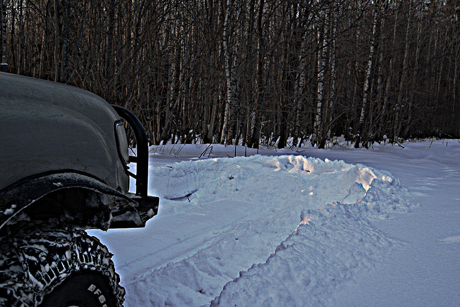 Т.е. пробиваем с разгону валик снега , что нагребли перед собой и сколько то едем по инерции на полном газе, на максимально возможной высокой передаче, преодолевая адское сопротивление снега. Как только уткнулась - сразу газ бросаем, стоп, назад и все поновой. Так вот в местах где снег не такой плотный (переметы, низинки) иногда мощи хватает чтоб разогнаться и "выйти на глиссер" тогда машина как бы всплывает, за счет скорости, не закапывается и прет как танк. Адско греется, но едет, пока характер снега опять не изменится.В целину такой глубины и консистенции снега топтаться совершенно бессмысленно. А вот по своей колее бывает и что то подобное немного получается.