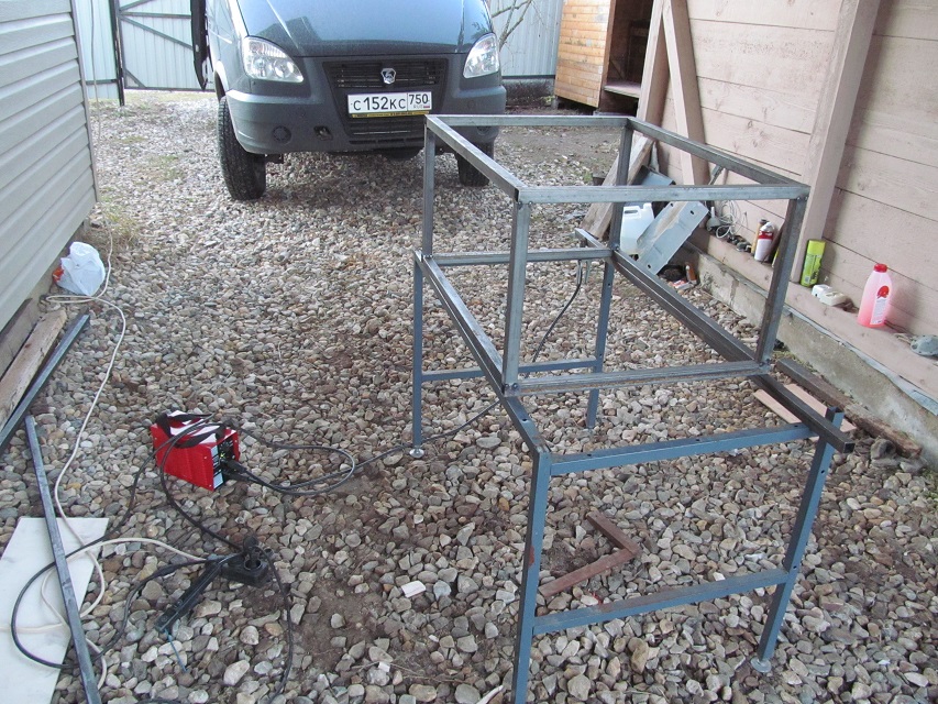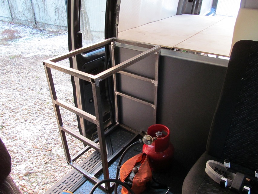 - Из профиля 25х25, сварил стеллажи и винтами прикрепил к полу и каркасу перегородки. Средняя часть спальника будет подъемной, для перевозки негабарита и доступа к багажу из салона.
