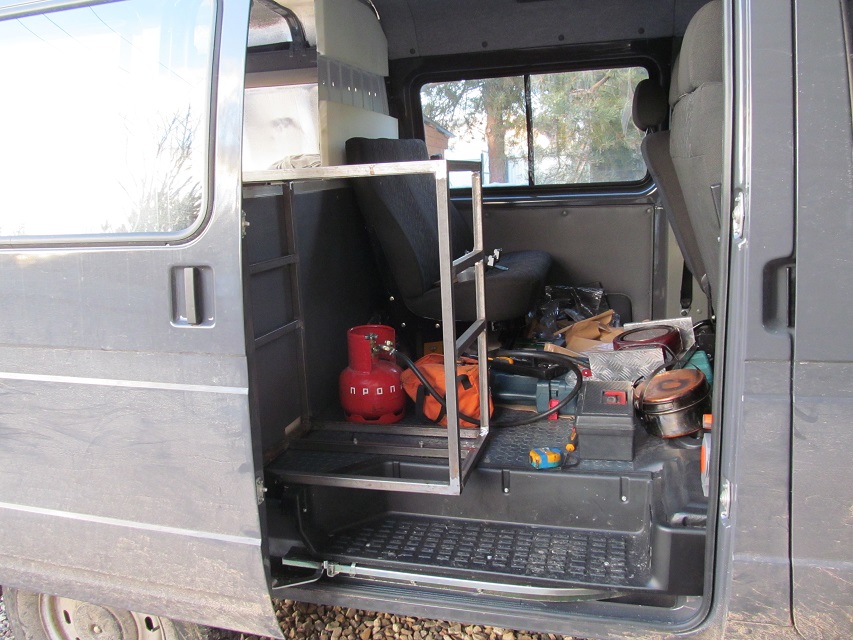 Из профиля 25х25, сварил стеллажи и винтами прикрепил к полу и каркасу перегородки. Средняя часть спальника будет подъемной, для перевозки негабарита и доступа к багажу из салона.