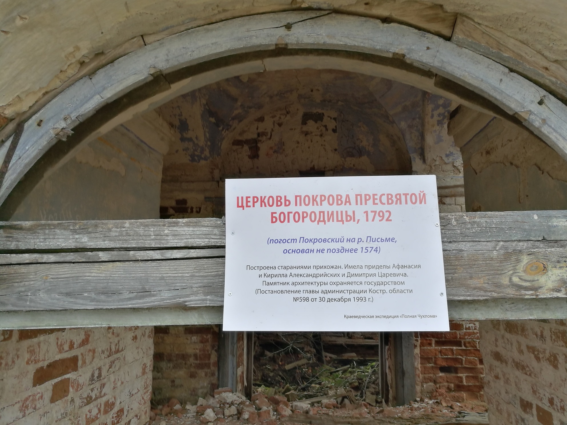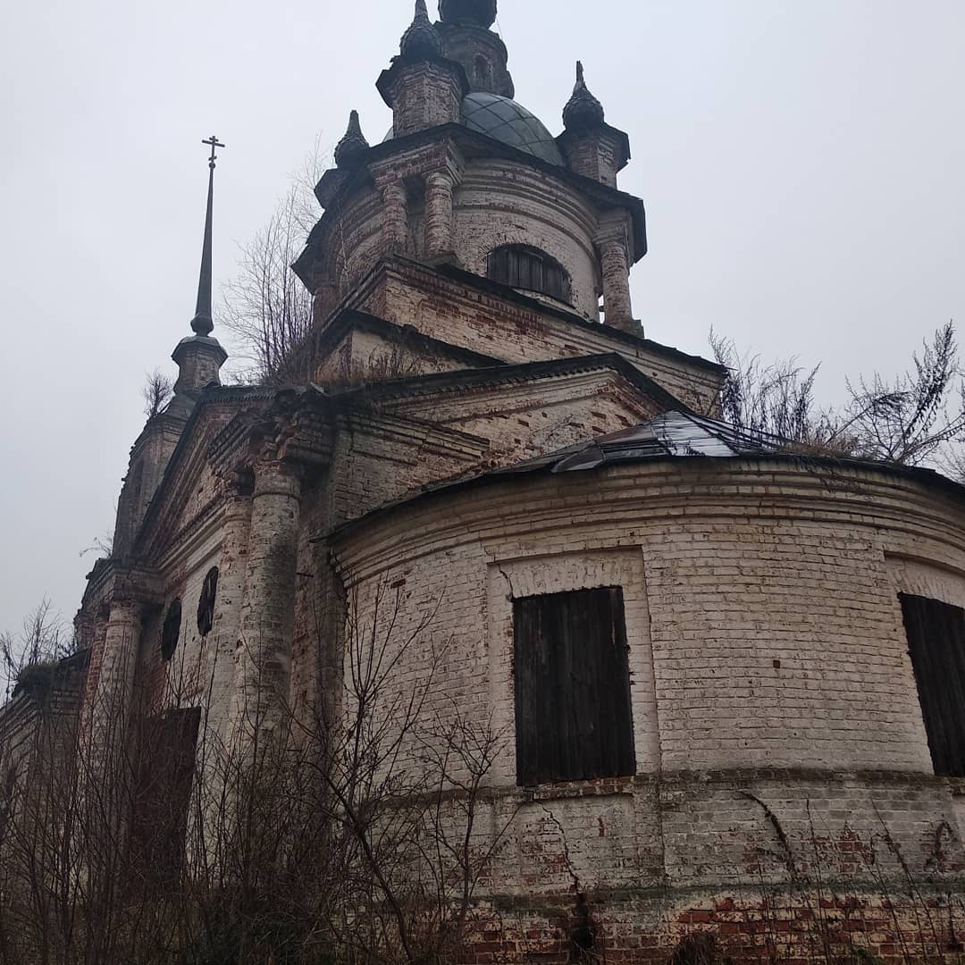 Команда "Окрута" Третий день Полной Чухломы 2018 Точка 42 Церковь Покрова Пресвятой Богородицы, что на реке Письме Кирпичный храм типа восьмерик на односветном четверике. Основной объём соединен широкой трапезной со стройной трёхъярусной колокольней. Построен в 1792 прихожанами. Имел приделы Афанасия и Кирилла Александрийских и Димитрия Царевича.